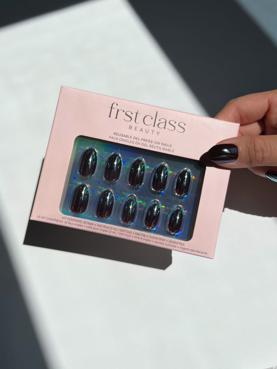 Align Frst Class nails starting at the cuticle and apply at a downward angle. Press firmly and hold for 90 seconds. If needed, file or clip to achieve desired shape.